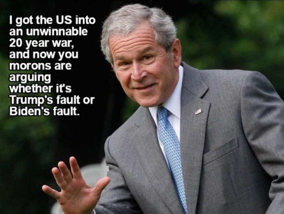 What really happened in Afghanistan was that we stayed way too long pursuing a hopeless situation. Probably some fault can be laid on Trump and Obama for dragging it out. But, if you really want to blame someone, there is George W. Bush, who I like to blame for, well, pretty much everything. 😉