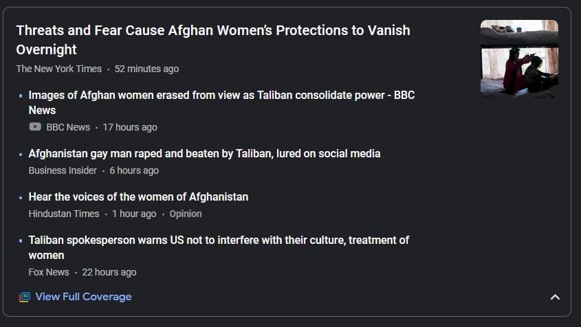 Now, to be sure, the Taliban taking over Afghanistan is probably going to be a human rights disaster. But, what is missing here? Do you see any articles in the news feed about why staying in Afghanistan would be bad?